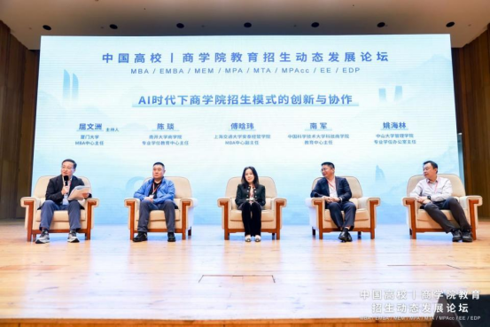 在主题为“AI时代下商学院招生模式的创新与协作”的行业对话环节,由厦门大学MBA中心主任屈文洲主持,南开大学商学院专业学位教育中心主任陈琰、上海交通大学安泰经管学院MBA中心副主任傅晗玮、中国科学技术大学科技商学院教育中心主任南军、中山大学管理学院专业学位办公室主任姚海林,围绕“AI时代下商学院招生模式的创新与协作”这一议题展开了深入探讨,并就AI赋能精准匹配、动态招生策略优化等达成共识,提出构建院校协作生态的倡议。