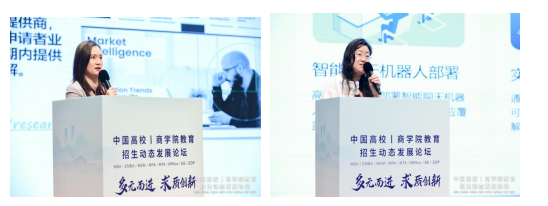 大中华区院校合作部主任、GMAC管理专业研究生入学委员会江玥发表了题为“驾驭未来浪潮:全球研究生管理教育的需求变革与战略机遇”的主题报告;腾讯教育南区生态合作负责人胡慧雯发表了题为“AI在教育招生领域的实践应用 ”的主题报告。