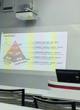 讲座伊始,梁新刚先生首先向各位同学说人工智能(大模型AI)未来已来,了解了下同学们所用的AI、借助电影《人工智能AI》指出人工智能中的“水晶球”于个人来说是手机AI的体现,于企业而言是客制化大模型经过经验数据的沉淀、调优的场景。AI技术包括执行设备(物联网-传感器)、数据、信息、知识和决策等五个层次。而现在的大模型在知识层面,加上一个agent,变身决策层没问题。
