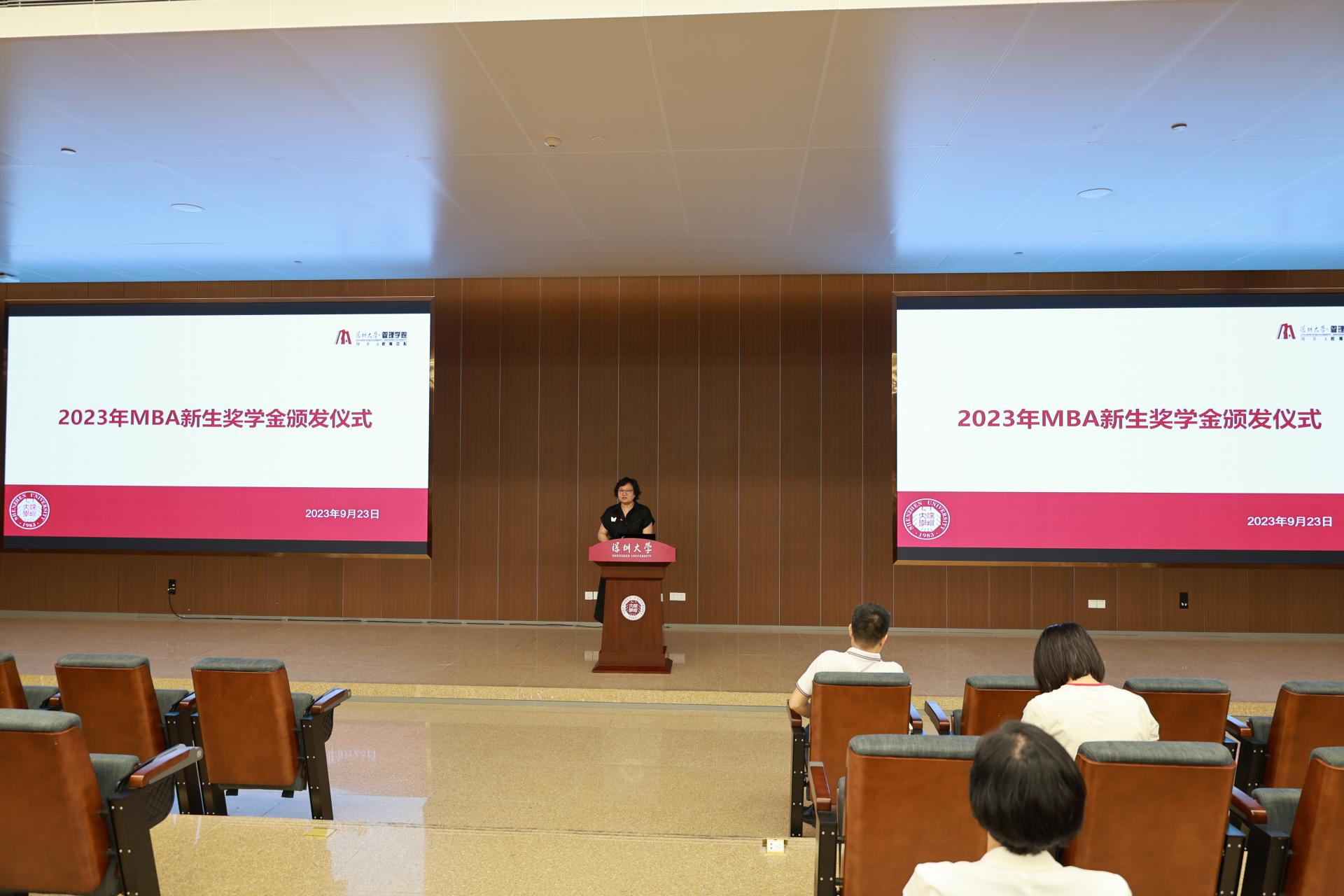 新生奖学金颁发仪式由MBA教育中心朱婕老师主持。MBA教育中心主任崔世娟宣读了《关于颁发2023年深圳大学工商管理硕士(MBA)新生奖学金的决定》。根据《深圳大学工商管理硕士(MBA)新生奖学金管理办法(暂行)》的相关规定,经深圳大学MBA教育中心评定、审核、公示等环节,共评出41位2023级MBA新生奖学金获得者。其中包括6位获得MBA新生奖学金一等奖(5位MBA新生、1位医疗管理方向MBA新生),奖学金20000元;15位获得新生奖学金二等奖(12位MBA新生、3位医疗管理方向MBA新生),奖学金15000元;20位获得新生奖学金三等奖(17位MBA新生、3位医疗管理方向MBA新生),奖学金10000元。