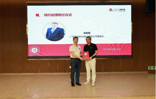 9月23日晚,深圳大学2023年MBA特约教授聘任仪式暨MBA大讲堂(第110讲)隆重举行,广东天安新材股份有限公司董事长吴启超受聘为管理学院特约教授,并受邀作“仰望星空 脚踏实地”主题讲座分享。
