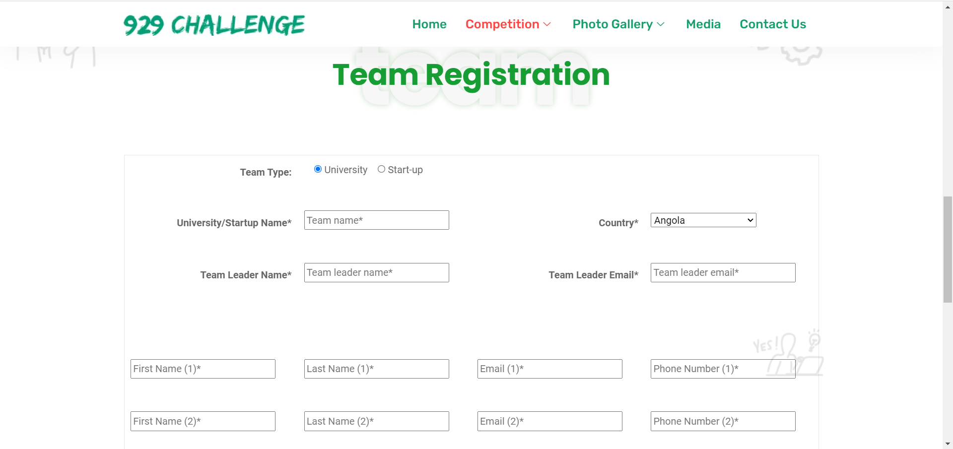 进入新页面,下拉页面至“Team Registration”部分,选择赛道*、国家或地区,填写大学名称(仅限大学组)或团队名称(仅限初创组)、队长姓名、队长邮箱**、队员信息。***