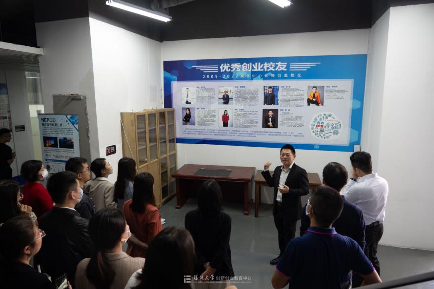 在正式进入“股东汇报会”这一环节之前,主讲教师带着MBA班各位学员参观了深圳大学创新创业教育中心,介绍了中心的发展历程和获得的成果。