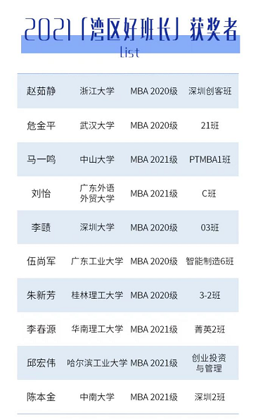 会上,对《湾区好班长湾区魅力班级》进行了揭晓与颁奖。我校2020级MBA03班班长、学员李赜获得“湾区好班长”荣誉称号,一同获奖的同时有浙江大学、中山大学管理学院等多所国内著名高校MBA班长。