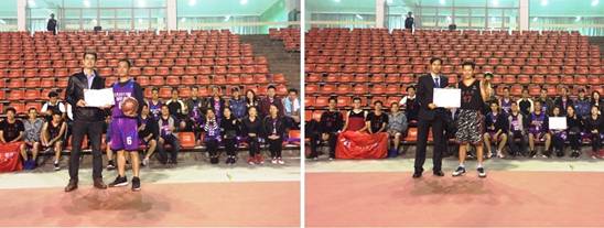 裁判员吹响终场哨声后,双方队员相互握手致意。此刻球场上没有对手,只有同学间的亲密友谊和球员间的心心相惜。赛后举行了简短的颁奖仪式,并邀请管理学院教职工篮球队代表牛奔教授和叶娘越老师担任颁奖嘉宾,相继为获得亚军奖(2017秋MPA)、冠军奖(2016春MBA)、最佳组织奖(2017秋MPA)和最有价值球员(潘国良)的代表队和球员颁发获奖证书和奖品。