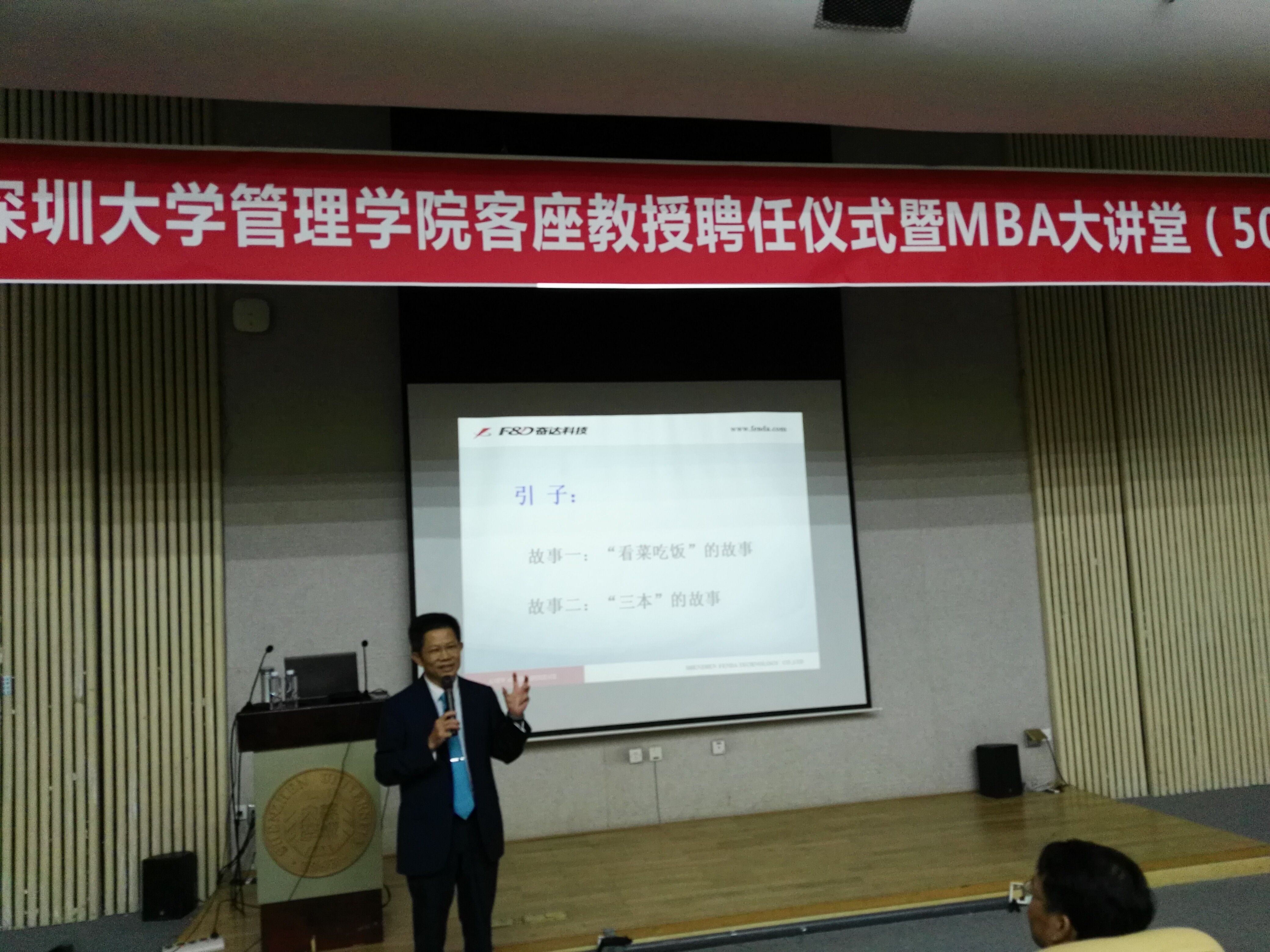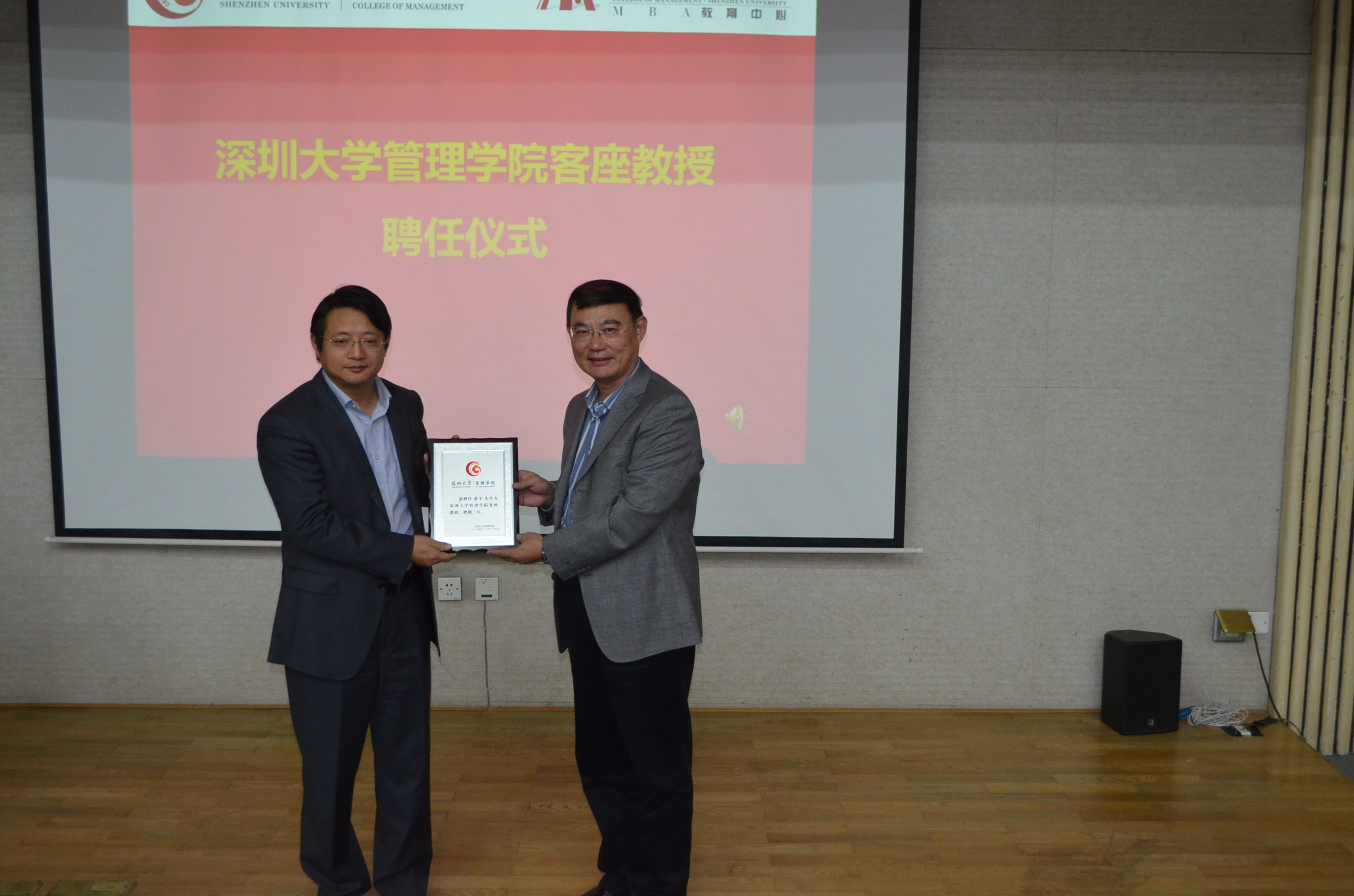 11月29日晚上,深圳大学管理学院客座教授聘任仪式暨MBA大讲堂第50讲在科技楼举行。深圳市奋达科技股份有限公司董事长肖奋先生,深圳市泓锦文资产管理有限公司总裁蔡平先生受聘为管理学院客座教授。