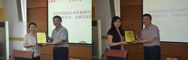 会议开始,管理学院院长刘军教授为教学工作会议致辞并祝贺MBA中心获得“全国百优案例组织优秀奖”,管理学院书记李丽教授为刘军、涂荣庭、林梅、林旭东、张蕾、孙俊英、甘小冰七名MBA任课教师颁发“2014-2015年度第1学期 MBA优秀教师”证书,管理学院院长刘军教授为张蕾、林梅两位老师颁发“MBA名牌教师”奖牌。