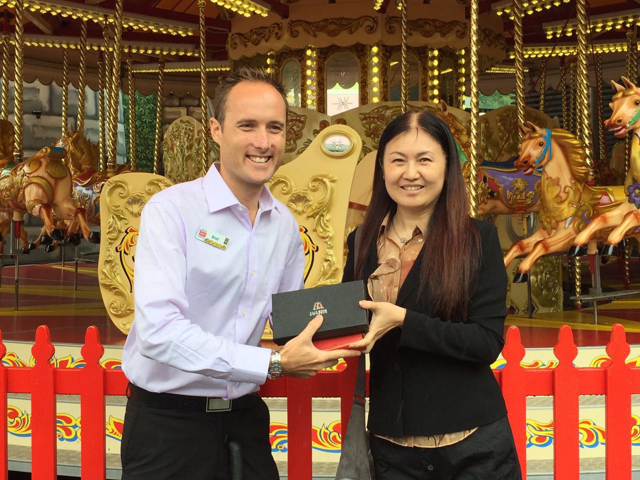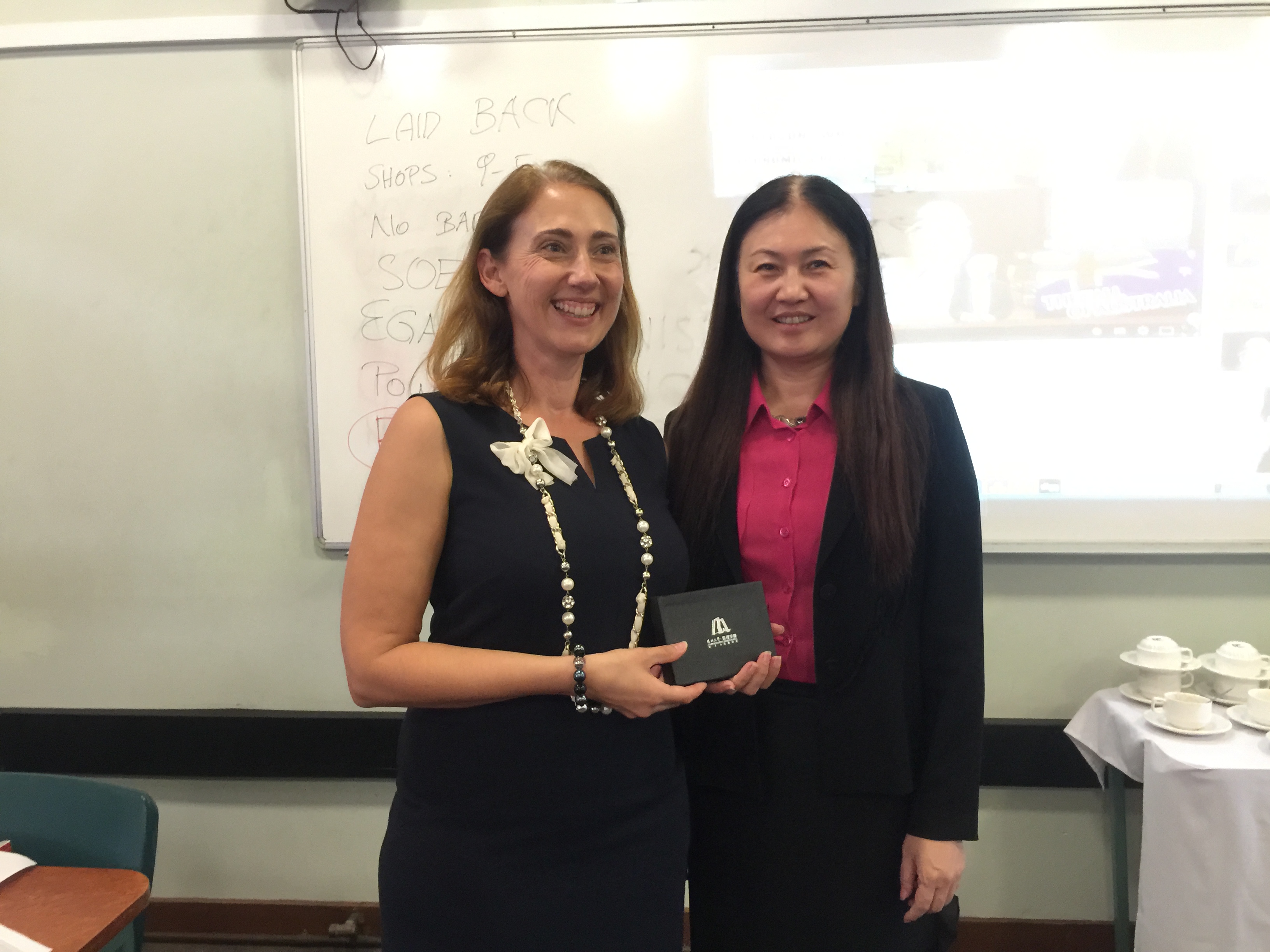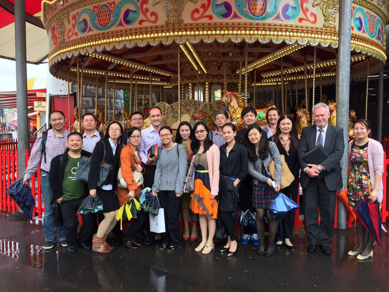 接下来在悉尼的企业和学校的参访中,皆由ICMS大学的教授Ms.Michelle Hill全程陪同。深大MBA师生16人,参访了Luna Park Sydney,了解了此游乐园运作模式。参观Four Pines Brewery,了解了啤酒制造的生产过程,及销售模式。最后参观了ICMS大学的校园、教室、图书馆等,并在教室上了一堂由学校教授主讲的课程关于中澳双边贸易的课题。还在学校餐厅就餐,了解在校学生的生活情况。李丽教授代表深圳大学,临别时,对于每一个接待者赠与深圳大学的小礼品以示友好,并拍照留影。