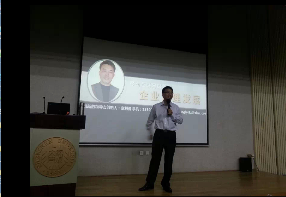 2014年11月8号的晚上在深圳大学的科技楼大讲堂,我们荣幸的请来了原中兴通讯公司副总裁,多家知名上市企业高管首席管理顾问师--章利勇先生,为我们带来了一场与时俱进,别具一格的精彩演讲。演讲的主题就叫《移动互联网时代的企业管理发展》。