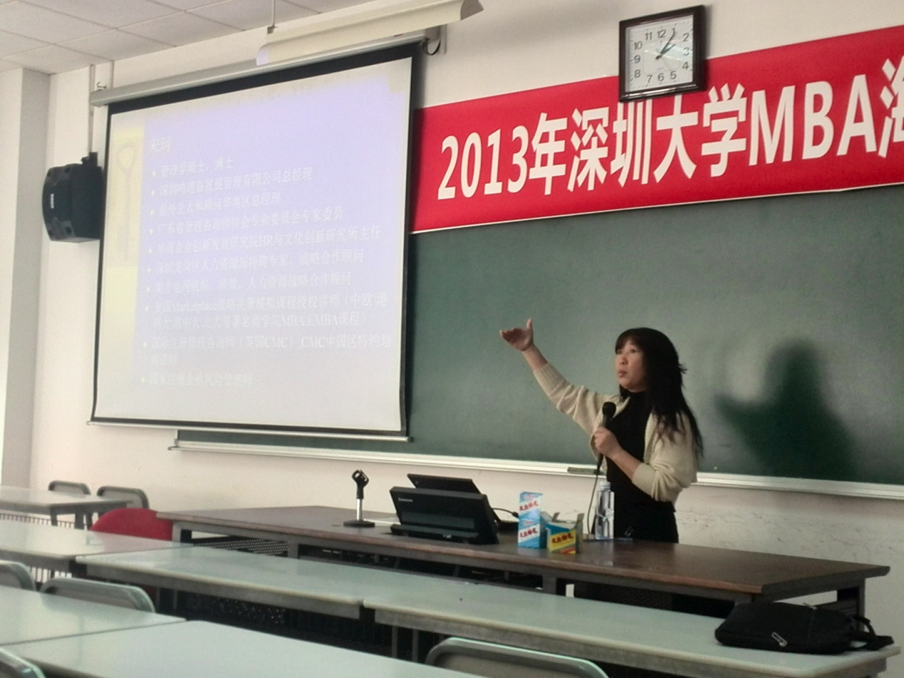 元月11日下午,深圳大学MBA的人力资源管理课堂上请到深圳鸣道谷发展管理有限公司总经理宋珂博士,宋博士还是国际注册管理咨询师(英国CMC),CMC中国区特约培训讲师、国家注册企业风险管理师。宋珂博士此次受到深大管理学院苏方国老师的特别邀请,专程为2013级MBA的学生们现身说法,讲解企业薪酬实战管理中的实际问题,以及解决方案。