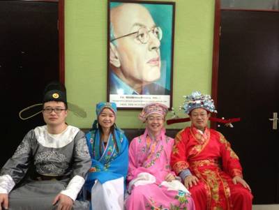 表演共分五组进行,同学们在认真准备登台表演。图为绿茶组“卓越驸马培训记”的定妆照。