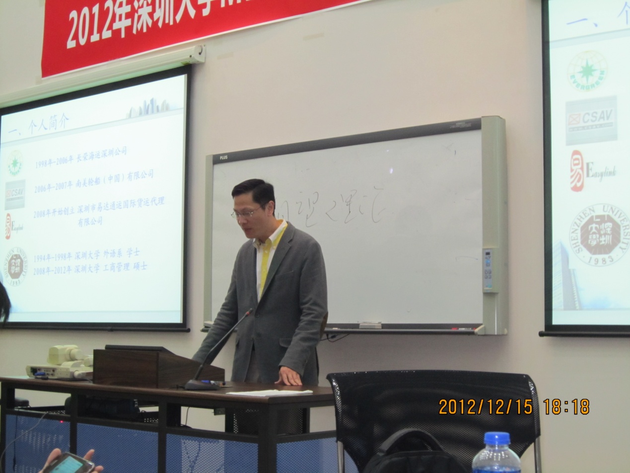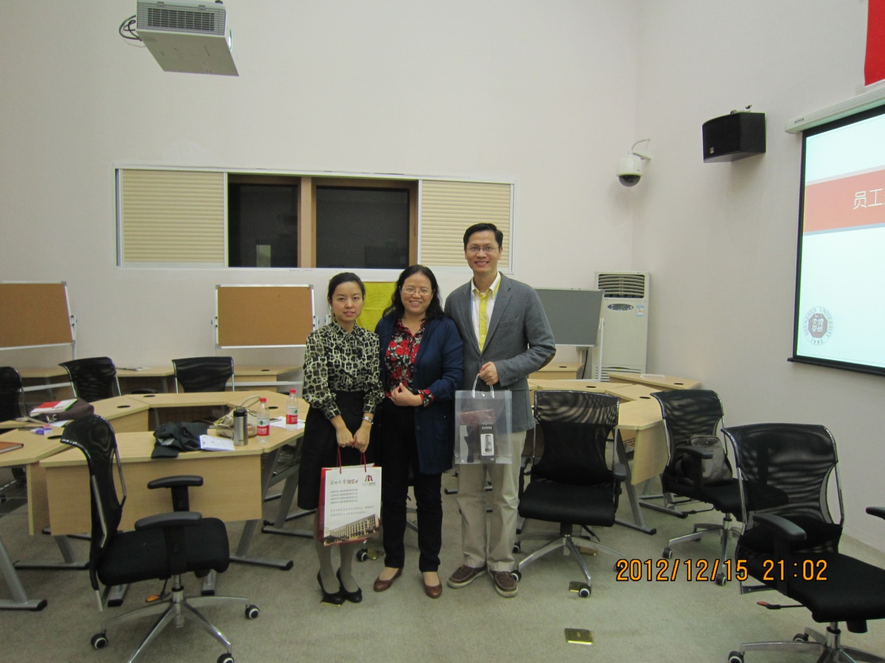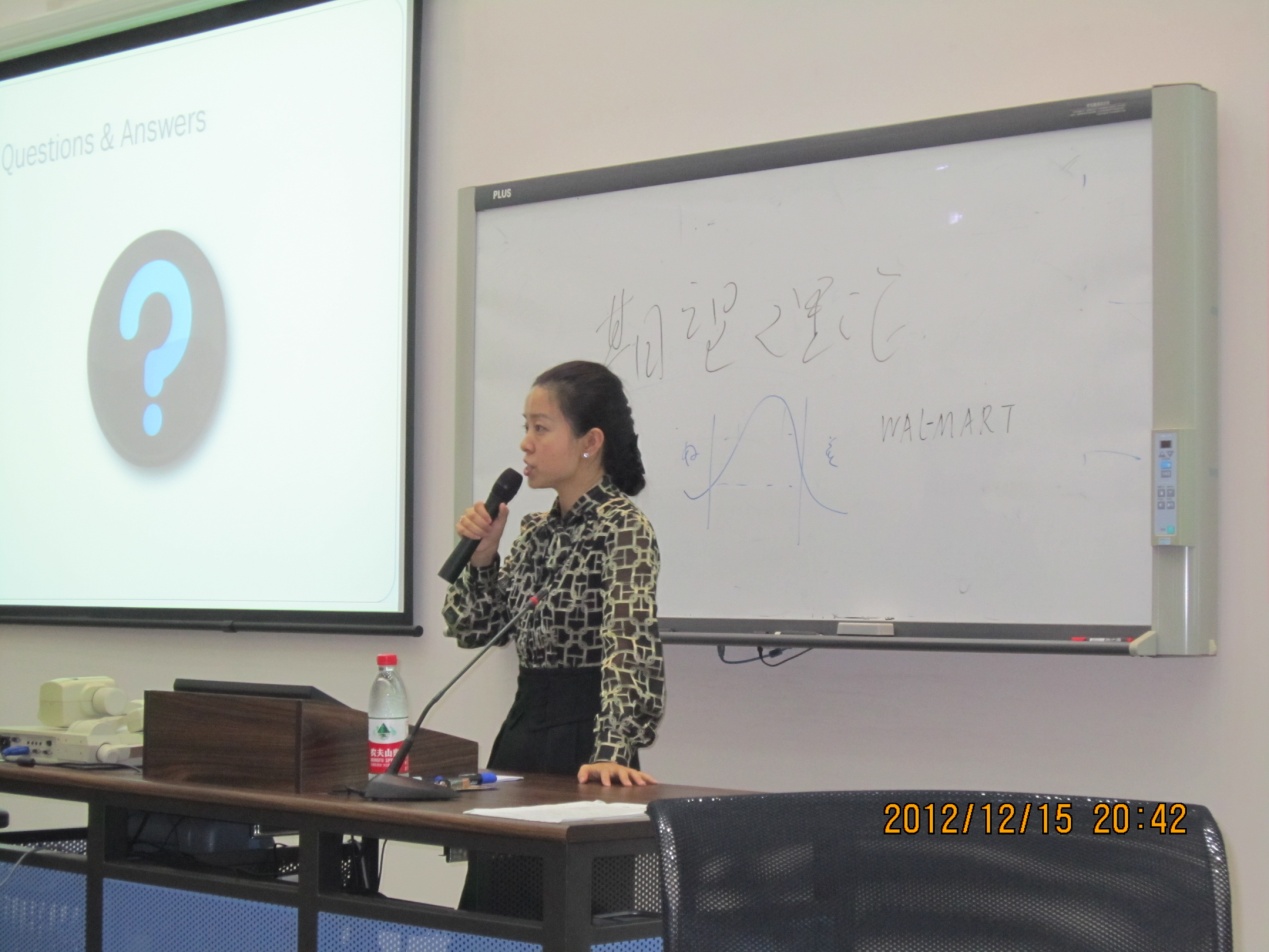 2012年12月15日(星期六)晚上,2011秋“战略人力资源管理”班,在文科楼H3-400A MBA专用教室,《员工关系管理》课程专职教师张转玲老师,外聘深圳市易达通运国际货运代理有限公司总经理蔡勇弟先生,和沃尔玛全球采购中心WMGS人力资源部经理周群女士,和同学们一起研讨、交流在员工关系管理方面的经验和心得体会。