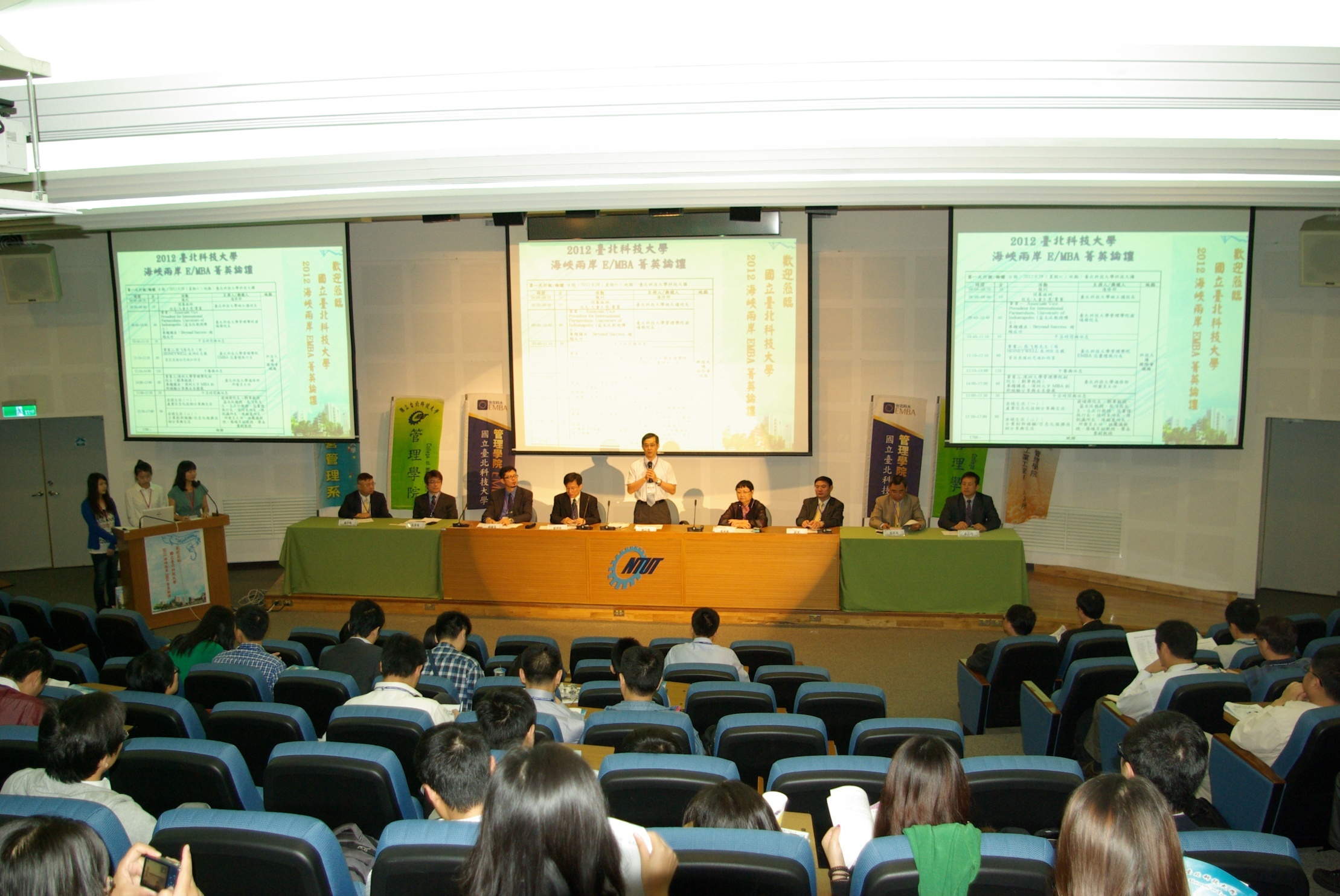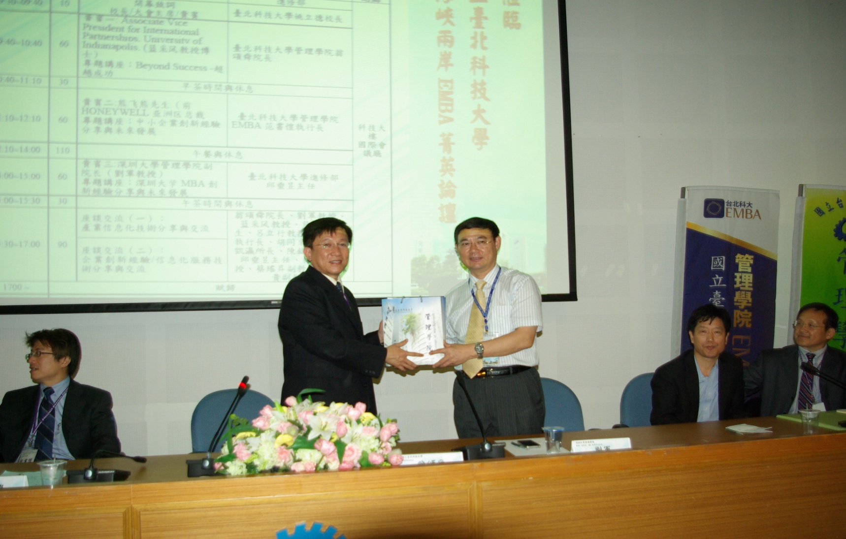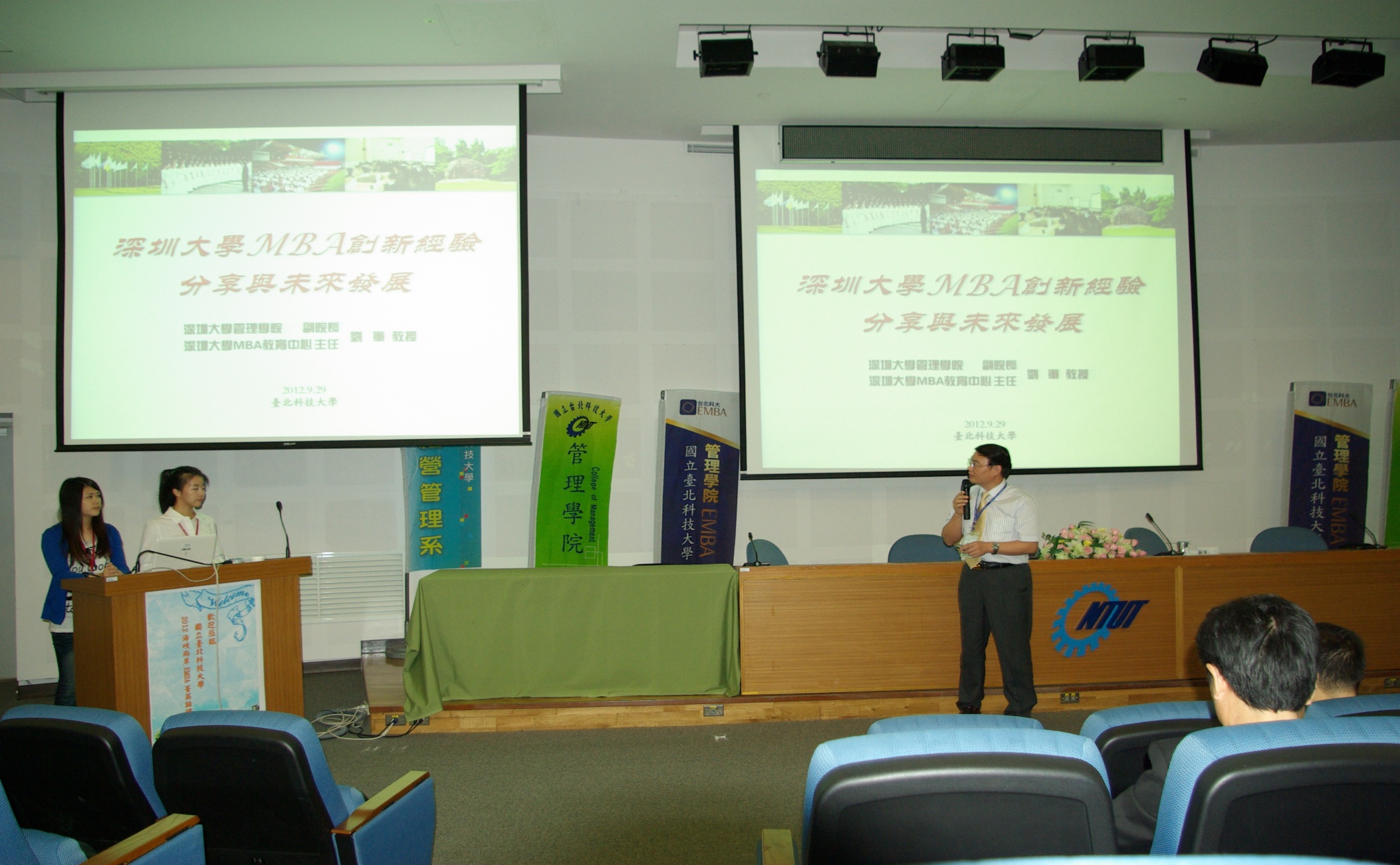 第二天,深圳大学MBA师生一行来到了台北科技大学,参加了2012台北科技大学海峡两岸E/MBA校友精英论坛。台北科技大学姚立德校长致开幕词后,深圳大学管理学院副院长、MBA中心主任刘军教授做了精彩的《深圳大学MBA创新经验分享与未来发展》的专题讲座。刘院长深入浅出、独具匠心、大方幽默的经验分享博得了台下海峡两岸E/MBA校友的阵阵掌声。