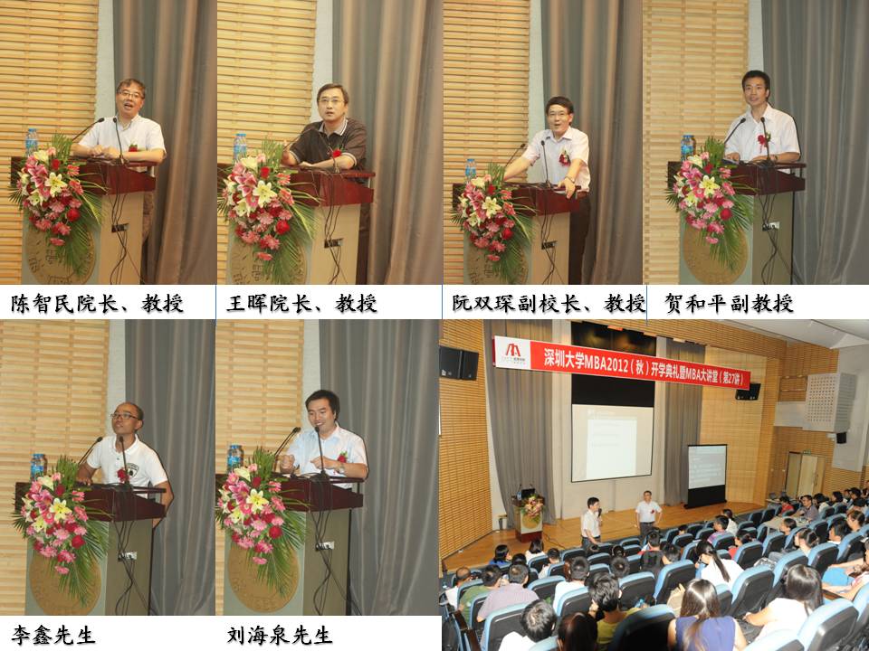 下午2点,深圳大学MBA2012(秋)开学典礼在深圳大学科技楼2号报告厅隆重举行。典礼由深圳大学管院副院长、MBA教育中心主任刘军教授主持。深圳大学副校长阮双琛教授,研究生院(筹)院长王晖教授,管理学院院长陈智民教授,管理学院副院长李丽教授,管理学院党委副书记赵大宇老师,管理学院贺和平副教授,MBA案例中心主任潘燕春副教授,MBA教育中心的教学服务支持部主任林旭东教授、学员职业发展部主任蒋建武博士、战略发展与招生部主任陈林老师、行政服务管理部主任钟嘉琳老师,以及李爱君老师、赵心老师、伏特慧老师和党崇雷老师,深圳大学MBA天行健俱乐部理事长、深圳市经纬科技有限公司IT部经理李鑫先生出席了典礼。