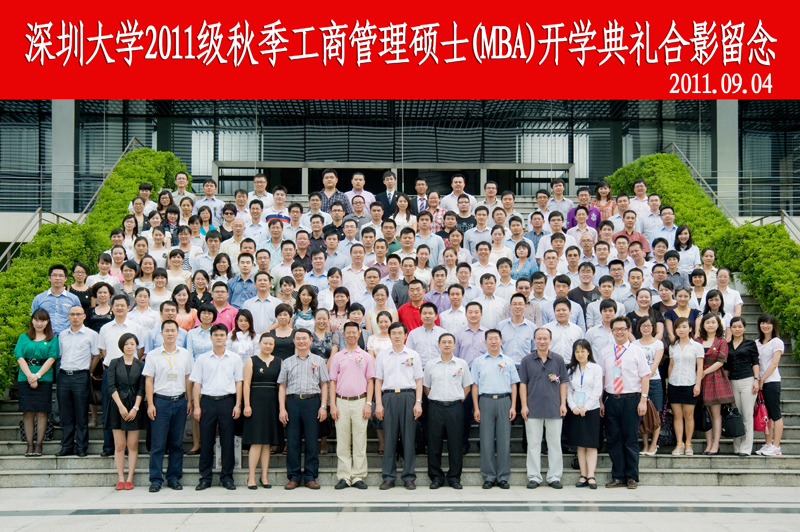 深圳大学MBA2011(秋)开学典礼于2011年9月4日下午2点在深圳大学科技楼2号报告厅隆重举行。典礼由管理学院副院长、MBA教育中心主任刘军教授主持。深圳大学副校长阮双琛教授,研究生院(筹)院长王晖教授,研究生院(筹)党委书记杜龙老师,管理学院党委书记宋涛教授,实践导师代表、中国宝安集团股份有限公司党委书记、人力资源总监张育新先生,管理学院崔世娟教授,管理学院林旭东教授,管理学院蒋建武博士,天行建俱乐部理事长、吉象木业销售经理尚跃东先生,MBA教育中心管理团队,30位MBA在校学员与160余位MBA新生共同见证了这一时刻。