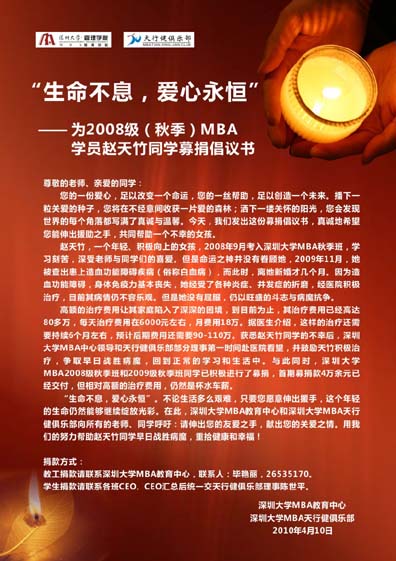 2010年4月10日深圳大学MBA教育中心向全中心师生再次发出以“生命不息,爱心永恒:为2008级(秋季)MBA学员赵天竹同学募捐”为主题的捐款倡议后,中心老师和MBA学员积极开展直接捐赠和物品义拍等各种形式的奉献爱心活动,为赵天竹送去中心师生的关爱与祝福。