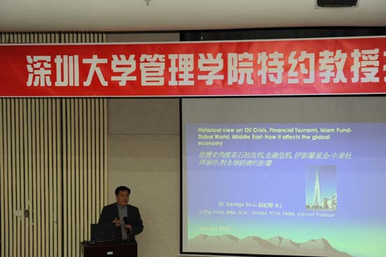特约教授苏祖耀先生做了题为《从历史角度谈到了石油危机、金融海啸、伊斯兰基金—中东迪拜事件对全球经济的影响》的演讲。他回顾了至今60年来世界范围内发生的一些大事件,阐述了这些事件对全球经济的影响,同时指出指出在进行投资之前除了需要进行技术分析、基本面分析以外,还需要关注世界范围内的地域政治。