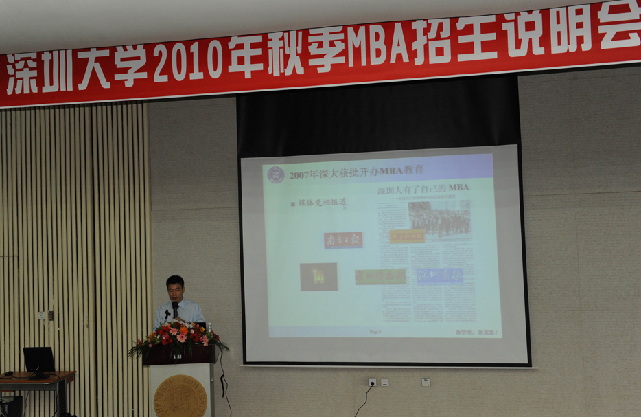2009年10月11日下午,深圳大学2010年秋季MBA项目招生说明会暨MBA公开课在深圳大学科技楼三号报告厅成功举行。来自各个行业的近90名计划报考深大MBA的考生参加了招生说明会。