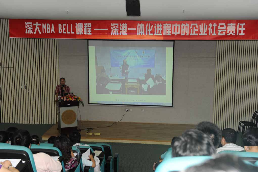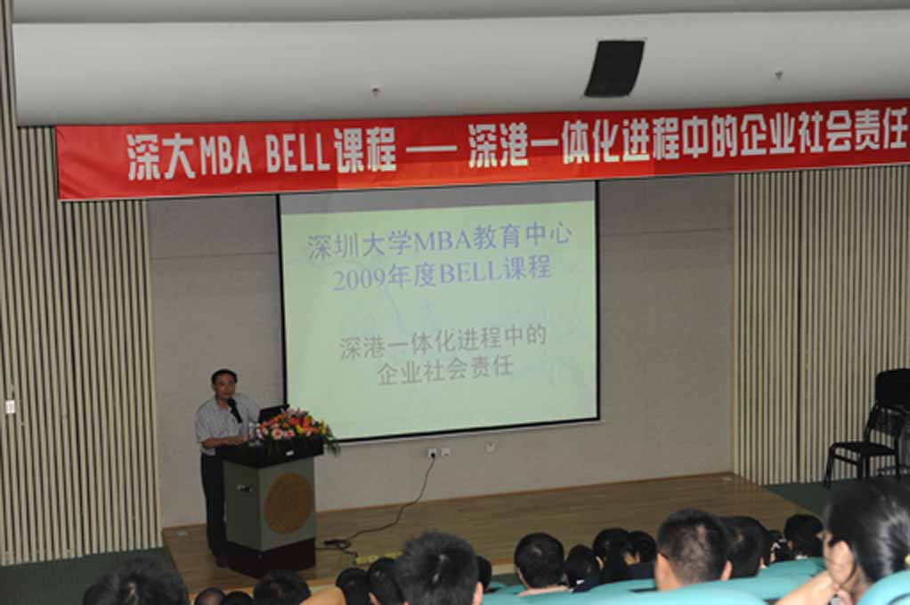 2009年9月12日晚7时,深圳大学2008级秋季MBA班、2009春季MBA班和秋季MBA班共100余人齐集深圳大学科技楼3号报告厅,迎来了由深圳大学MBA教育中心主办的“深大MBA BELL课程---深港一体化进程中的企业社会责任”系列讲座开课仪式。