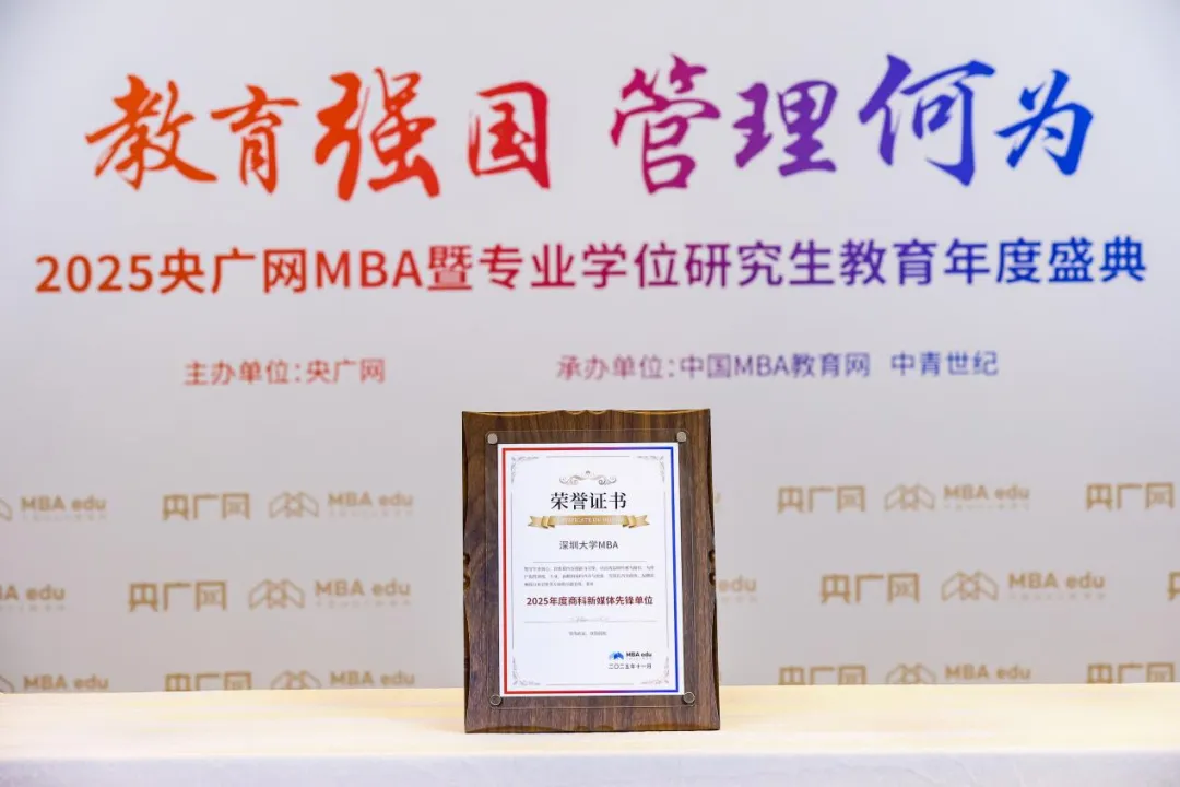 11月21日,由央广网主办、中国MBA教育网承办的“2025央广网MBA暨专业学位研究生教育年度盛典”在北京举办。为贯彻教育部教育数字化战略部署,中国MBA教育网依托大数据平台与新媒体传播指数模型,对全国200余所商学院MBA官方微信公众号开展监测评估。经严谨分析验证,深圳大学MBA凭借优秀新媒体运营能力与传播成效,荣获“2025年度商科新媒体先锋单位”。