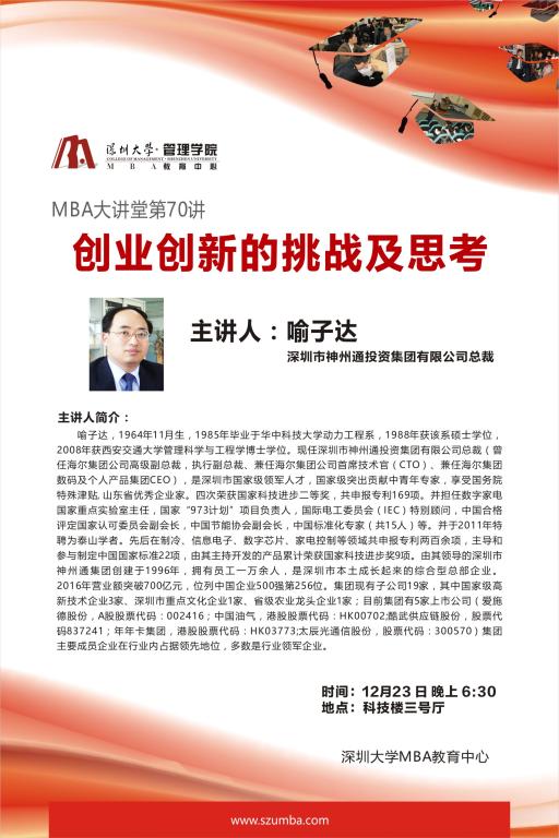 喻子达,1964年11月生,1985年毕业于华中科技大学动力工程系,1988年获该系硕士学位,2008年获西安交通大学管理科学与工程学博士学位。现任深圳市神州通投资集团有限公司总裁(曾任海尔集团公司高级副总裁,执行副总裁、兼任海尔集团公司首席技术官(CTO)、兼任海尔集团数码及个人产品集团CEO),是深圳市国家级领军人才,国家级突出贡献中青年专家,享受国务院特殊津贴, 山东省优秀企业家。四次荣获国家科技进步二等奖,共申报专利169项。并担任数字家电国家重点实验室主任,国家“973计划”项目负责人,国际电工委员会(IEC)特别顾问,中国合格评定国家认可委员会副会长,中国节能协会副会长,中国标准化专家(共15人)等。并于2011年特聘为泰山学者。先后在制冷、信息电子、数字芯片、家电控制等领域共申报专利两百余项,主导和参与制定中国国家标准22项,由其主持开发的产品累计荣获国家科技进步奖9项。由其领导的深圳市神州通集团创建于1996年,拥有员工一万余人,是深圳市本土成长起来的综合型总部企业。2016年营业额突破700亿元,位列中国企业500强第256位。集团现有子公司19家,其中国家级高新技术企业3家、深圳市重点文化企业1家、省级农业龙头企业1家;目前集团有5家上市公司(爱施德股份,A股股票代码:002416;中国油气,港股股票代码:HK00702;酷武供应链股份,股票代码837241;年年卡集团,港股股票代码:HK03773;太辰光通信股份,股票代码:300570)集团主要成员企业在行业内占据领先地位,多数是行业领军企业。