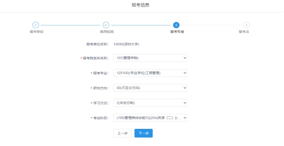 (1)如报考MBA,报考院系为“107(管理学院)”,报考专业为“125100(专业学位)工商管理”,研究方向为“00(不区分方向)”,学习方式为“2(非全日制)”,考试科目为“(199)管理类联考综合能力、(204)英语二”。