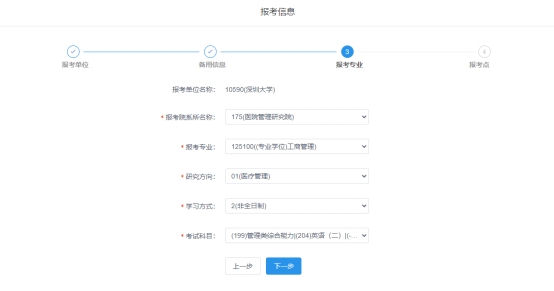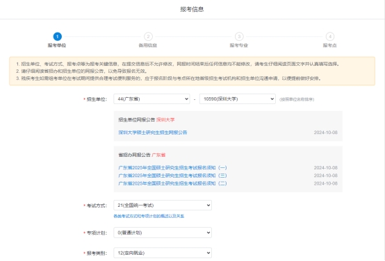5.网页跳转至报考信息页面,招生单位为“44(广东省)-10590(深圳大学)”,考试方式为“21(全国统一考试(含联合考试))”。如有专项计划的考生则根据自身情况进行选择报名,没有则选择“无”。报考类别为“12(定向就业)”,定向单位根据自身情况进行填写,入学前后工作单位可以有变动。