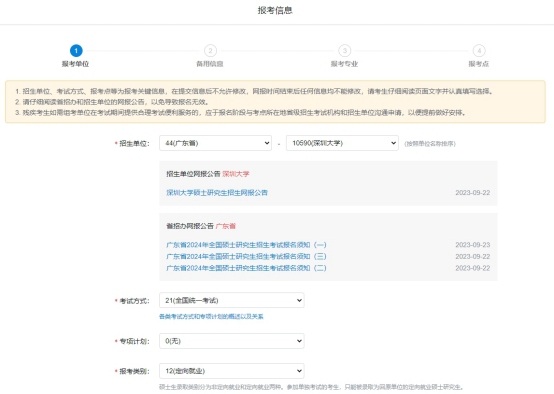 5.网页跳转至报考信息页面,招生单位为“44(广东省)-10590(深圳大学)”,考试方式为“21(全国统一考试(含联合考试))”。如有专项计划的考生则根据自身情况进行选择报名,没有则选择“无”。报考类别为“12(定向就业)”,定向单位根据自身情况进行填写,入学前后工作单位可以有变动。