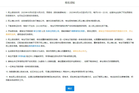 注:学籍学历应通过网上校验,如果考生持有2002年之前毕业的国内高等教育学历证书,或2002年之后毕业但未在高校学生学历信息管理系统相关数据库中注册的国内高等教育学历证书可在学信网(https://www.chsi.com.cn/wssq/)申请书面学历认证。未通过网上学籍学历校验的考生,国内学历应及时到中国高等教育学生信息网进行学籍学历认证,国外学历应在教育部留学服务中心进行认证。在确认环节时按照报考点要求进行核验。如有疑问,请及时联系咨询。