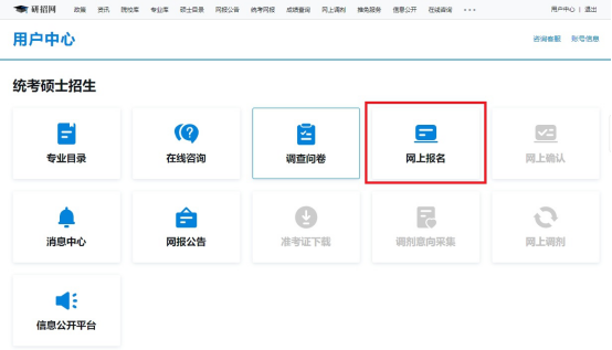 1.考生登录“中国研究生招生信息网”:https://yz.chsi.com.cn进行网报,预报名时间为:9月24日至9月27日(每天9:00—22:00),正式网报时间为:10月8日至10月25日(每天9:00—22:00)。考生进行用户登录后选择网上报名(如果没有学信网账号需要注册登录),具体见截图红框处。完成预报名的考生10月不用重复网报。