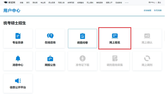 1. 考生登录“中国研究生招生信息网”:https://yz.chsi.com.cn进行网报,预报名时间为:10月10日至10月13日(每天9:00—22:00),正式网报时间为:10月16日至10月27日(每天9:00—22:00)。考生进行用户登录后选择网上报名(如果没有学信网账号需要注册登录),具体见截图红框处。完成预报名的考生不用重复进行正式网报。