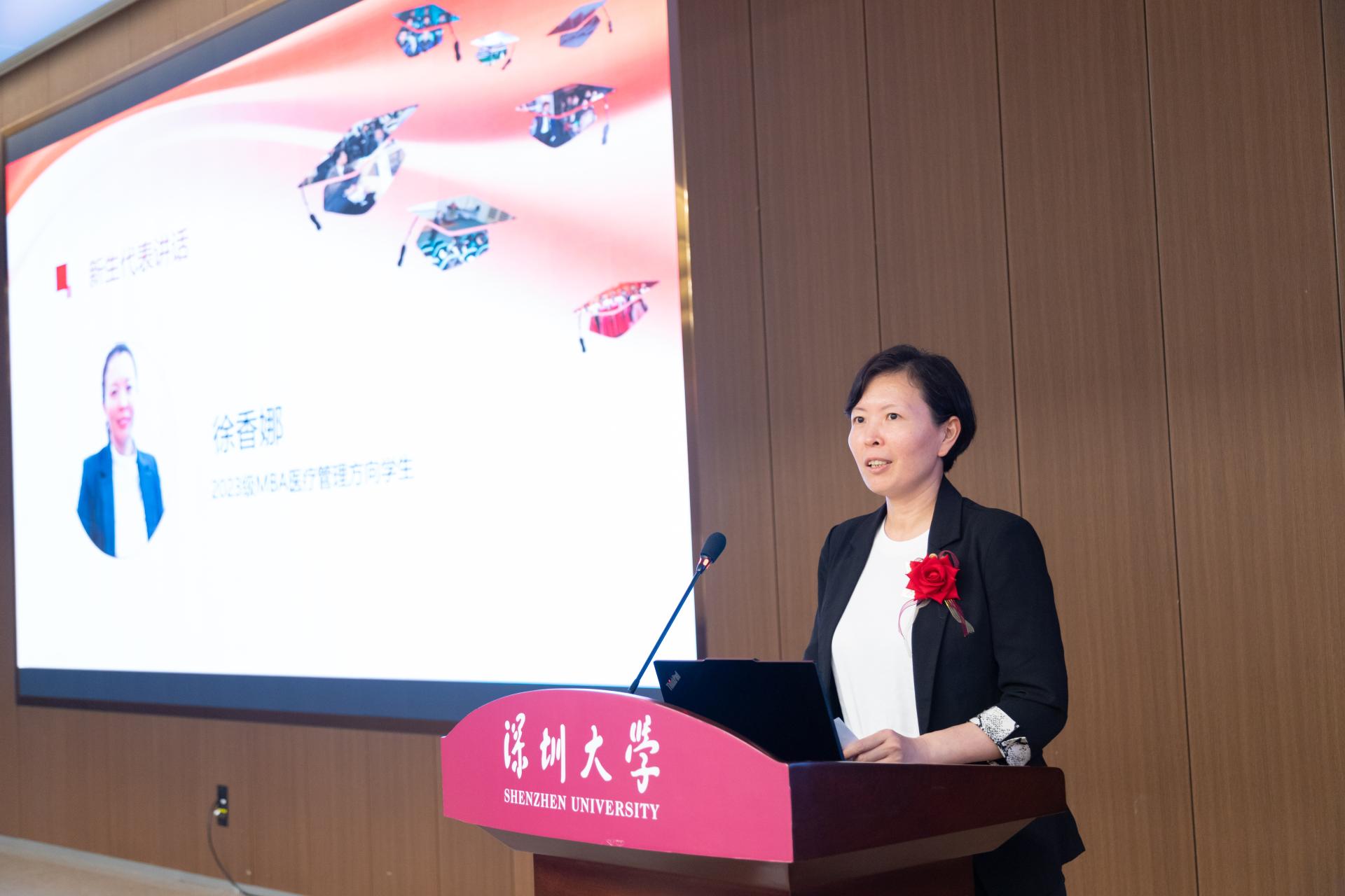 2023级MBA学生龚磊、MBA医疗管理方向学生徐香娜作为新生代表相继发言。两位新同学都谈到,怀着激动的心情来到深圳大学,漫步校园感受荔园文化。作为一名新生,希望能够在未来的学习中不忘初心,克服困难和挫折,积极探索,创造自己的精彩。