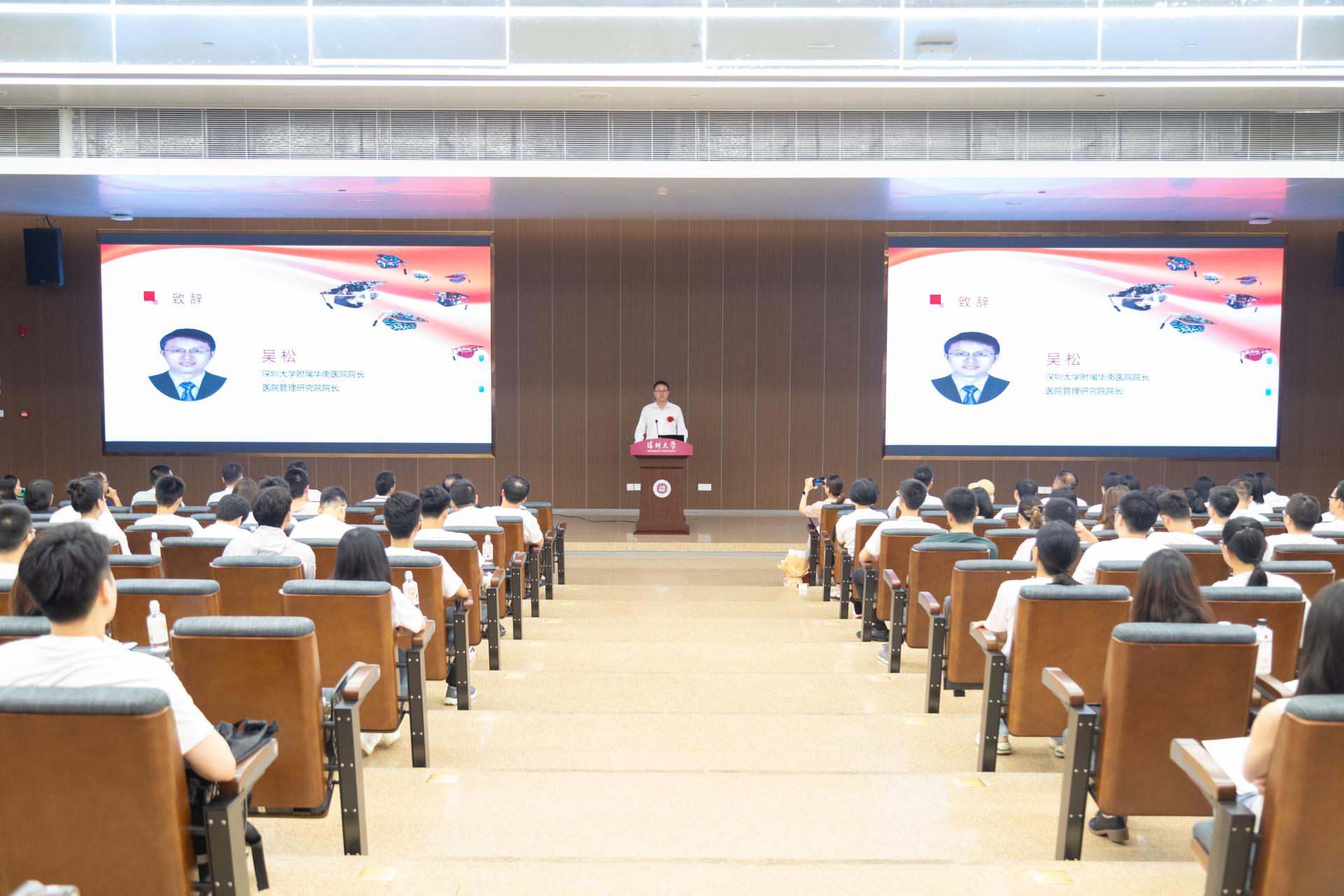 深圳大学附属华南医院院长、医院管理研究院院长吴松致辞。吴院长再次热烈欢迎入学新生。他表示医疗管理方向MBA已经进行了两届的招生,其中22级首届医疗班的同学们荣获了华南地区优秀班集体称号,未来将持续通过管理学院及深圳多家医院的深度产教融合,联合培养高层次应用型医疗管理人才,为深圳市乃至粤港澳大湾区培养高水平医疗管理者。吴院长期待并祝福所有新生在未来学习期间能够获得收获,锐意进取,成为胸怀家国、有担当的深大人;成为肩负使命、有情怀的医管人。