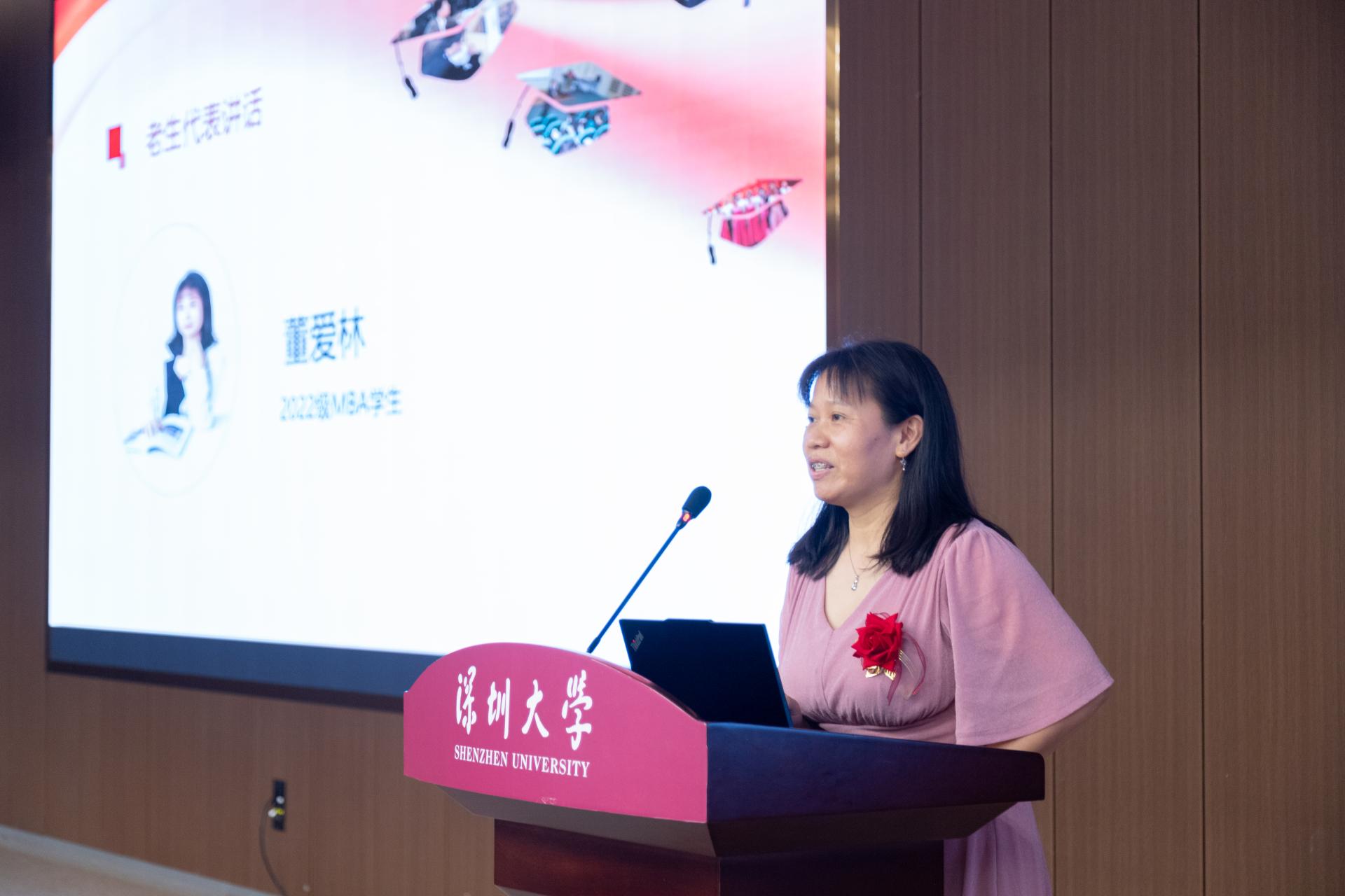 2022级MBA学生董爱林作为老生代表讲话。她向新生们分享了“八字”MBA学习经验,鼓励新生不仅要认真学习、珍惜同学间互助友谊,也要增强身体素质锻炼,加强运动。她欢迎有兴趣的新生参加亚沙赛收获不同体验和成长。