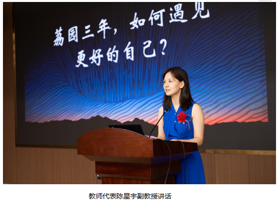 陈星宇副教授作为教师代表讲话,她以“荔园三年,如何遇见更好的自己”为主题做了分享,希望MBA新生能够尊重他人,一视同仁、学会释放压力和做真实的自己。她祝愿所有新生心中有光,不负热爱。