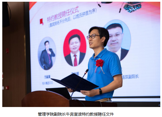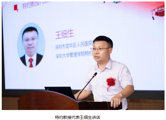 开学典礼中举行了管理学院特约教授聘任仪式。悦兴集团CEO邝保英、深圳市龙华区中心医院党委书记王光明、深圳市龙华区人民医院副院长王细生受聘为管理学院特约教授。管理学院副院长牛奔宣读聘任文件,深圳大学副校长汪永成为新聘特约教授颁发了聘书。王细生教授作为特约教授代表讲话。他说,如何提高医院管理水平,如何构建优质的医院医疗管理平台,是现在需要突破的瓶颈,他希望通过MBA人才培养,为粤港澳大湾区提供更多国际视野、专业素养、实践能力兼备的高层次应用型管理人才。他祝愿MBA新生能够学有所成,铸就辉煌未来。