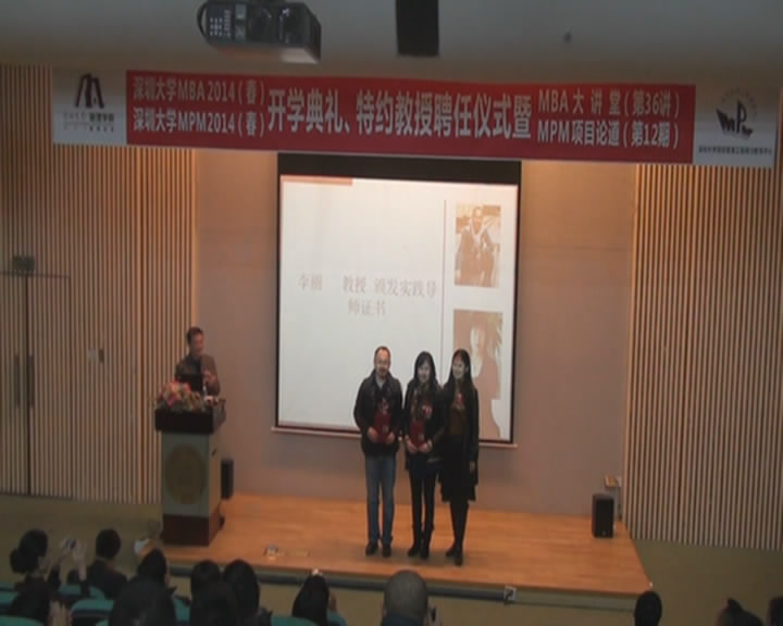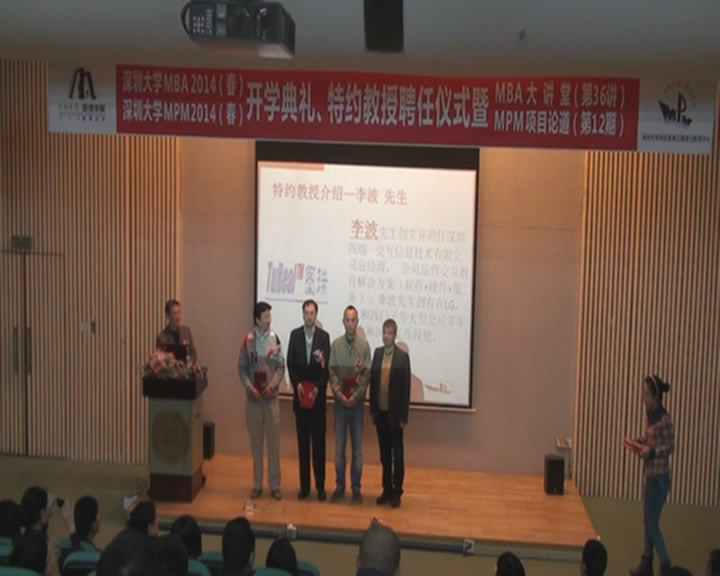 上周六,深圳大学2014年春季MBA、MPM开学典礼、特约教授聘任仪式暨MBA大讲堂(第36讲)、MPM项目论道(第12期)在深圳大学科技楼报告厅举行。深大管理学院副院长、MBA教育中心主任刘军教授亲自主持了此次开学典礼。在这个生机盎然的春季里,又一批新鲜力量加入了深大MBA、MPM的大家庭。