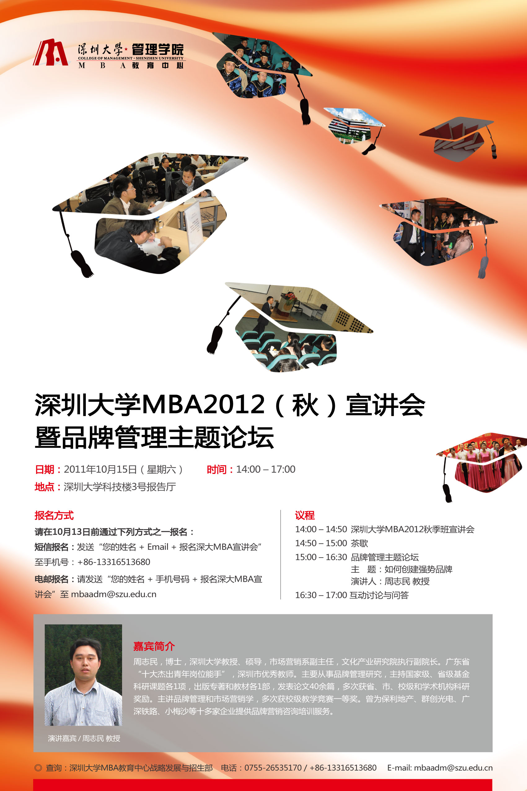 电邮报名:请发送“您的姓名 + 手机号码 + 报名深大MBA宣讲会”至 mbaadm@szu.edu.cn