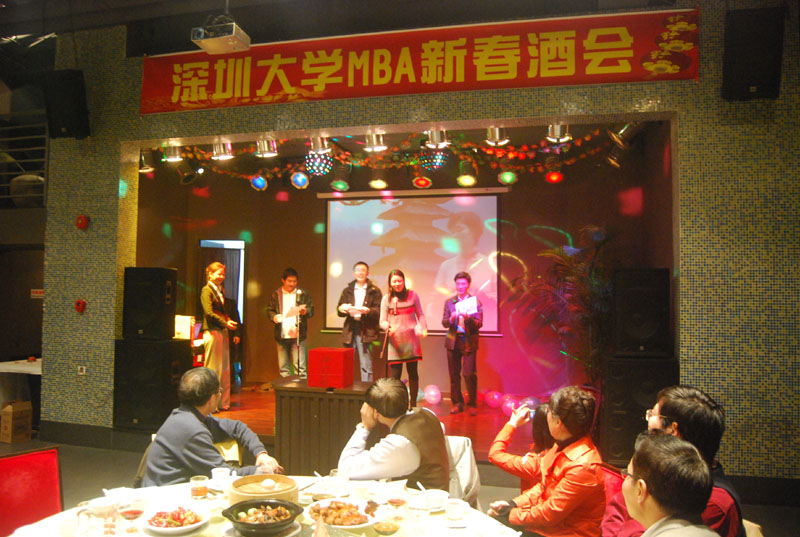 2009年1月10日 晚深圳大学MBA教育中心与08春秋季两班的学员共聚南山凯逸酒楼,举行了首次深圳大学MBA新春酒会。