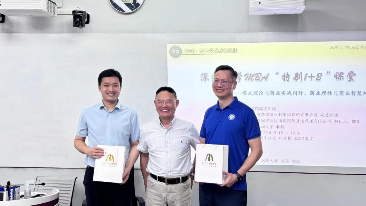 2024年10月19日,在刘军教授的精心安排下,MBA商业模式创新课程迎来了一堂特别“1+2”课堂,邀请到贝特瑞新材料集团股份有限公司副总经理徐瑞和深圳市易达通运国际货运代理有限公司董事长兼总经理蔡勇弟(08级MBA校友)作为嘉宾,与同学们共同探讨行业前沿。