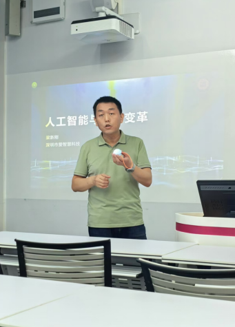 2024年10月20日上午,应《人工智能与商业变革》主讲老师冯元粤老师的邀请,深圳市爱智慧科技有限公司CEO梁新刚先生来到课堂,给MBA学员们分享如何通过人工智能技术推动企业的商业变革。