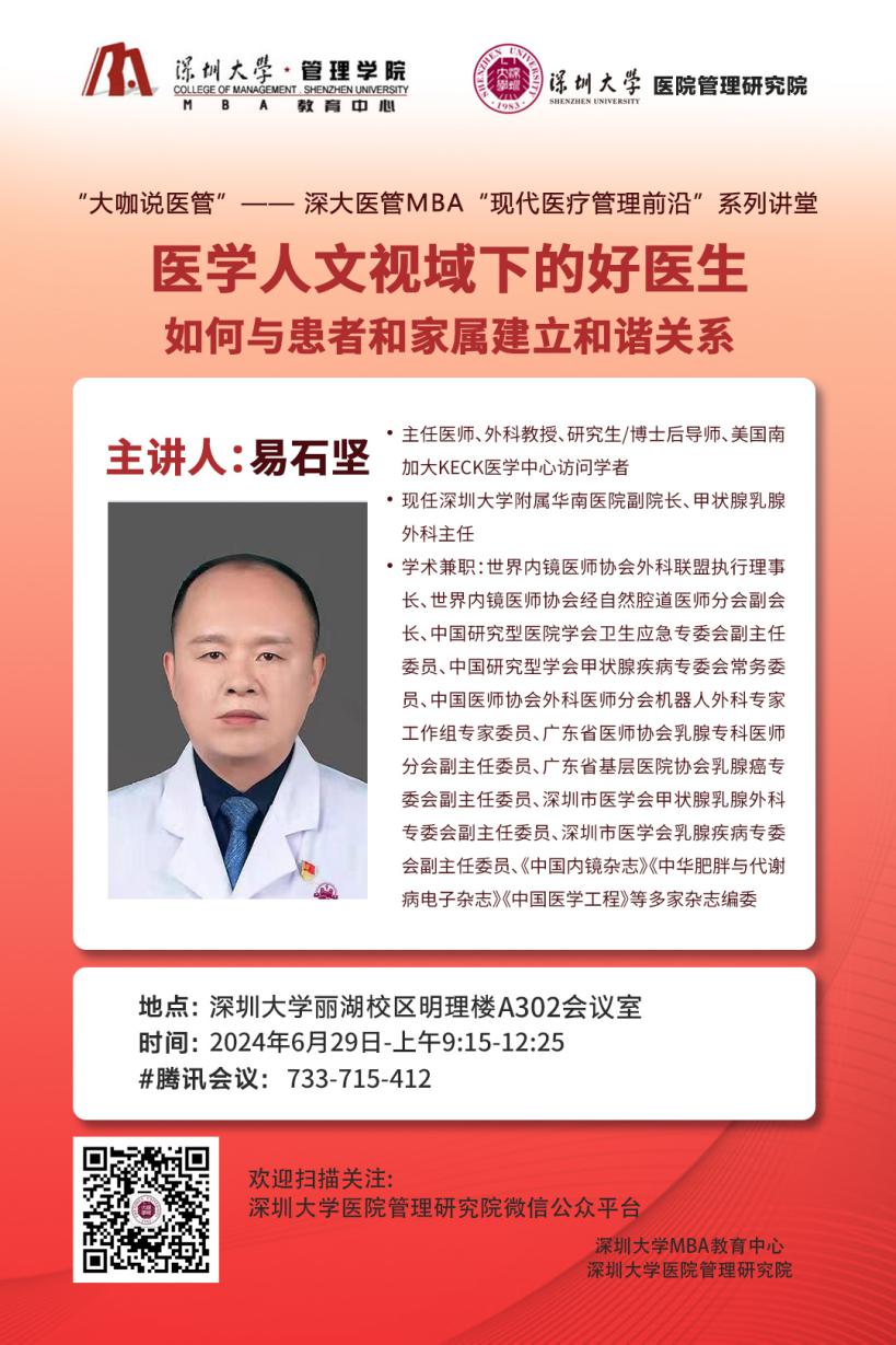 随着医疗技术的飞速发展,现代医疗技术变化与革新已成为推动医疗体系现代化的重要力量。然而,在追求医疗技术革新的同时,医学人文关怀同样不可或缺。近日,知名医学人文专家易石坚教授,就“医学人文视域下的好医生——如何与患者和家属建立和谐关系”这一主题,为医疗管理班的师生们带来了一场深刻而富有洞见的讲座。