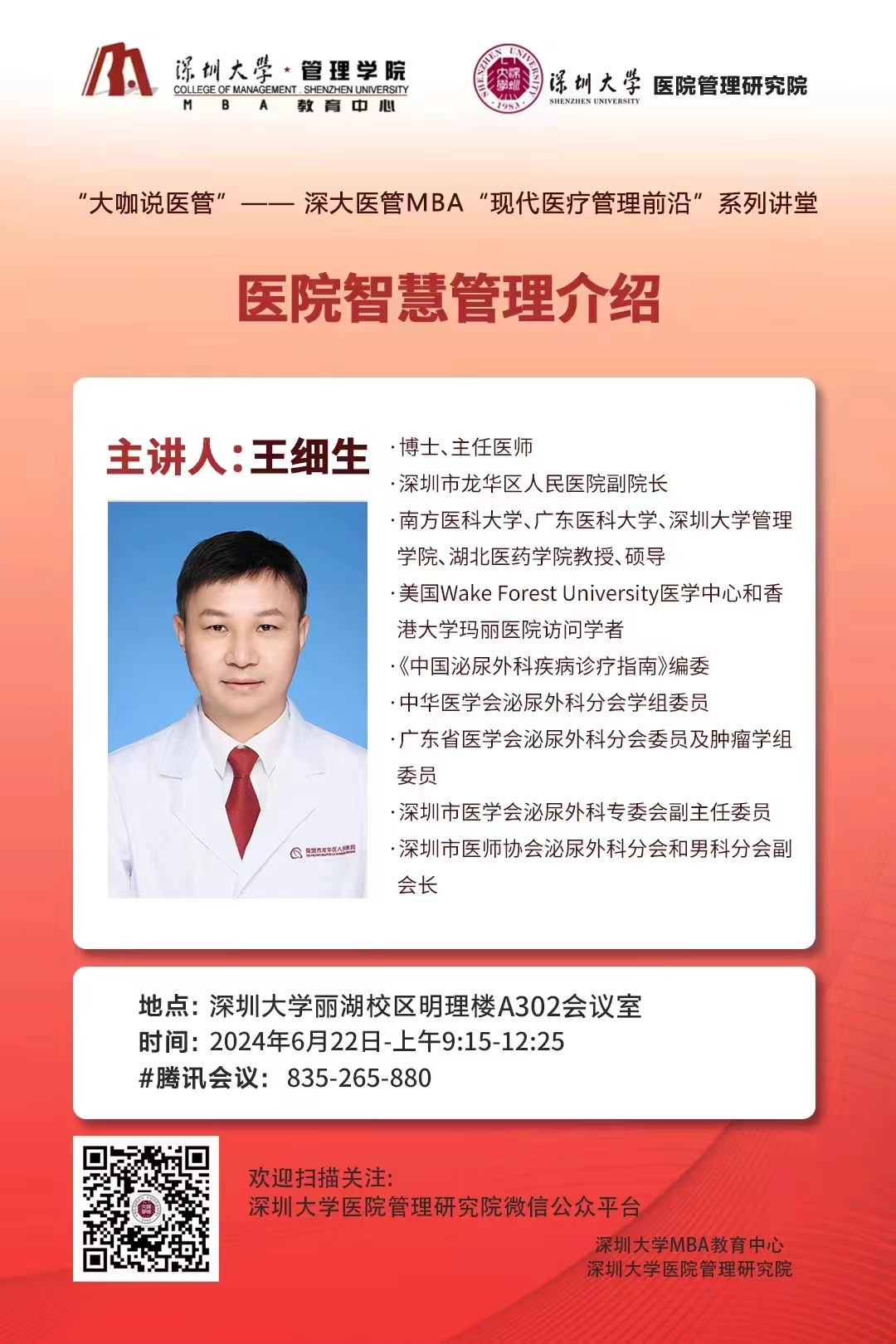 2024年6月22日上午,王细生博士从智慧医院发展历程、医院智慧管理主要内容、医院智慧管理具体应用场景及医院智慧管理建设意义等内容,深入浅出地给医疗管理的同学们带来一场干货满满的讲座,而同学们在轻松愉快的氛围中全面地而又详细地了解医院智慧管理的体系。