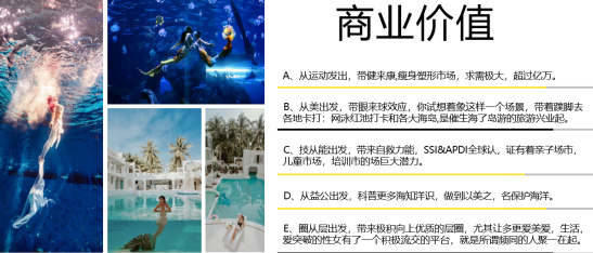 澜屿美人鱼潜水培训中心以美人鱼为切入点,致力于帮助每⼀位女性实现她们的⼈鱼梦,打造专属于自己的生活格调。澜屿顶层设计中以产品体系、运营体系、营销体系、供应链体系、财务体系、标准化体系为支撑,同时打造美⼈鱼商学院,营销矩阵,引导和扶持女性轻创业。澜屿价值观是包容、利他,创新、共享,共赢、成就。带领人们发现和感受品质美好生活。澜屿的企业愿景是打造全球化背景下的中国海洋文化品牌,立志成为海洋文化的传播者,海洋运动的组织者,海洋保护的实践者,极具社会价值的品牌企业。