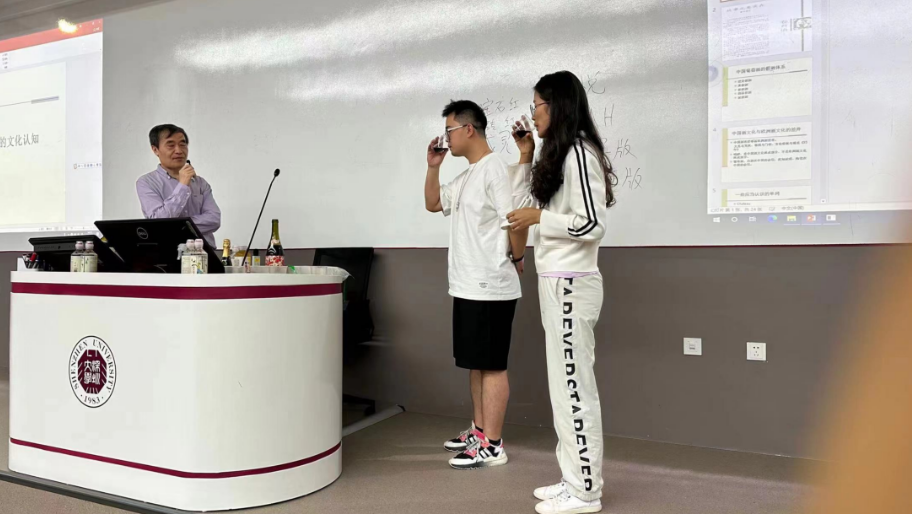 王海鸿老师以猜酒开题,课堂开始时拿起精致的小酒瓶问我们是否认识?老师拿的是轻奢香槟酩悦,以前一直用于王室,因此也有着“王室香槟”的美誉,由此开启红酒文化之旅。在讲到酒文化时,难免忽略中国的诗词,老师在黑板上写下黄庭坚的“胸中块垒正须酒,东海可揽北斗斟”,不可谓不豪迈壮阔。鲸吞豪饮俱是燕赵慷慨侠士,浅酌低唱不失倜傥风流人物;将寄予酒的志气,一一呈现。