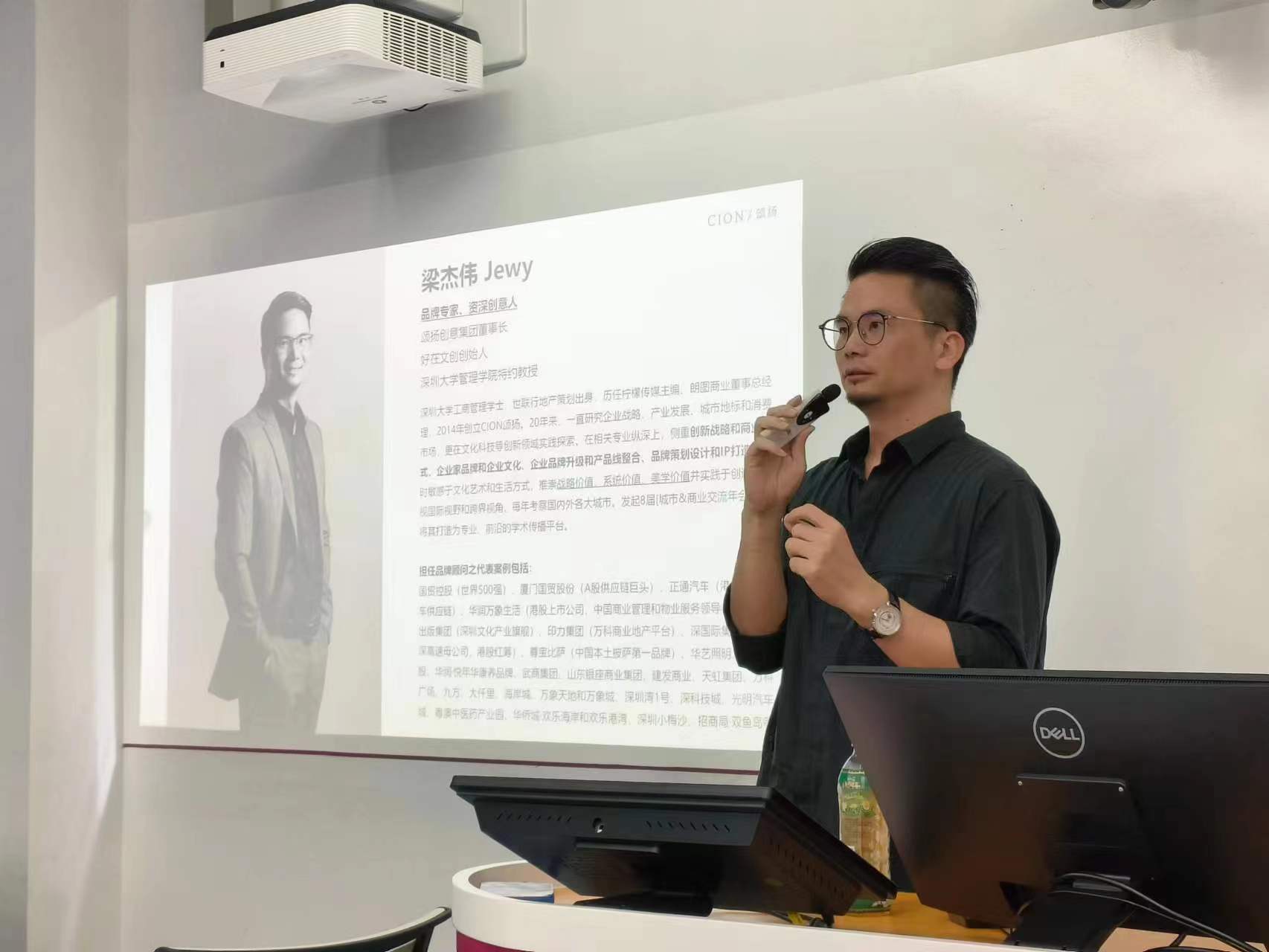 2023年4月8日下午,应MBA课程《品牌管理》主讲人周志民教授的邀请,深圳市颂扬集团董事长、好在文创创始人、深圳大学管理学院特约教授梁杰伟先生来到课堂,给MBA同学们分享优势品牌的创立和管理。梁杰伟先生是深大管院校友,世联行地产策划出身,2014年创立CION颂扬。20年来,梁总一直研究企业战略、产业发展、城市地标和消费市场,更在文化科技等创新领域实践探索,服务的对象包括华润万象、深国际、九方、欢乐海岸、大仟里等。