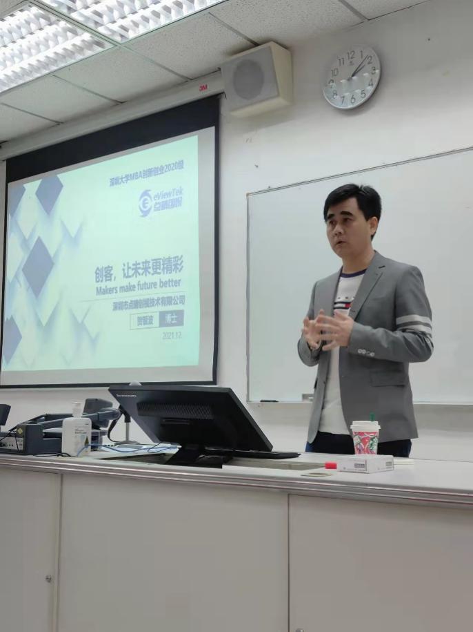 12月18日下午,应《创业团队与合伙人》主讲老师丁婉玲老师的邀请,深圳市点睛创视技术有限公司 CEO贺银波先生来到课堂,给MBA学员们分享他的创业经历。贺银波先生在浙江大学获得光学工程专业博士学位、在日本名古屋大学做过微纳米系统工程专业博士后,作为日本 21 世纪精英计划(the 21st Century Center of Excellence (COE))博士后特别研究员,对超高密度存储硬盘的研究不仅填补了业界空白,而且获得美国机械学会(ASME)/日本机械学会(JSME)的嘉奖,之后加入日本 TDK 集团,曾担任TDK 集团首席工程师。贺银波博士于2014 年创办深圳市点睛创视技术有限公司,专业从事微显示技术、光学引擎技术和新型光学器件的开发与生产,产品广泛应用于便携显示、先进制造和智能车载等领域,带领公司迅速成为全球光学引擎的核心供应商之一,打破了被海外企业垄断多年的格局。